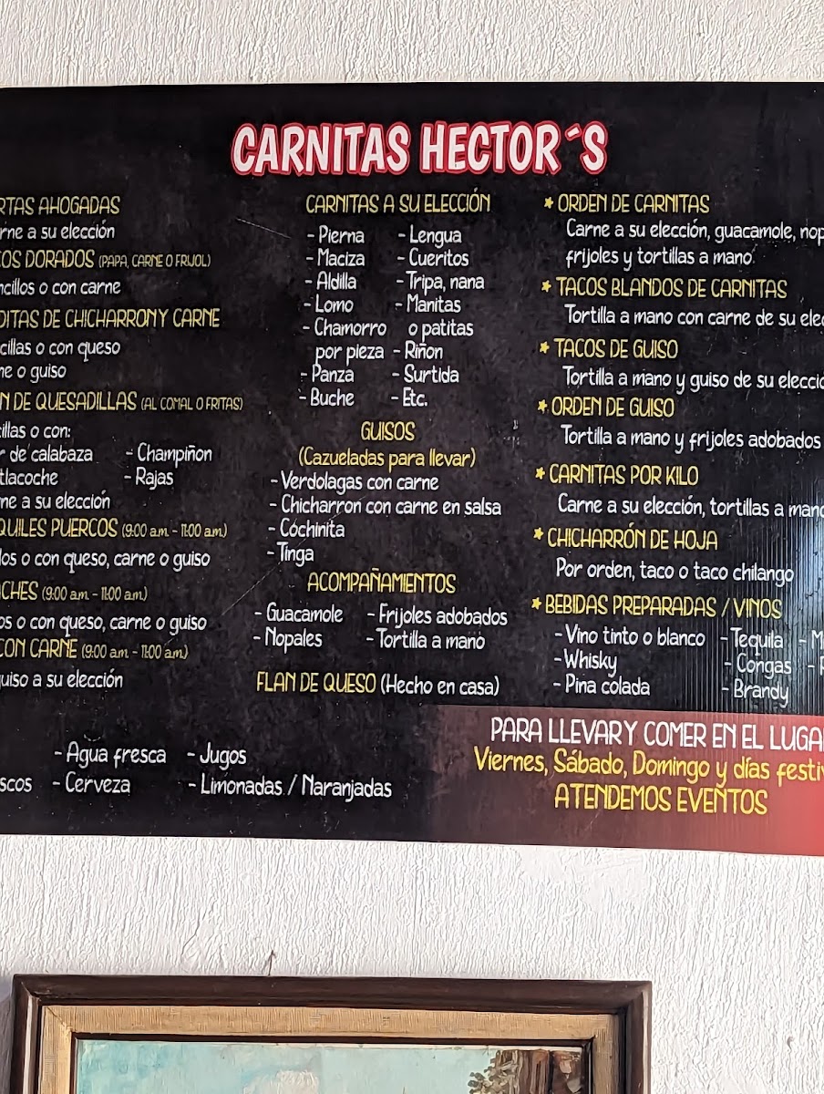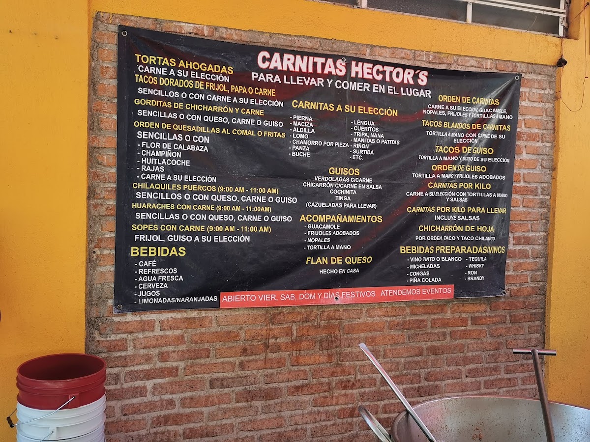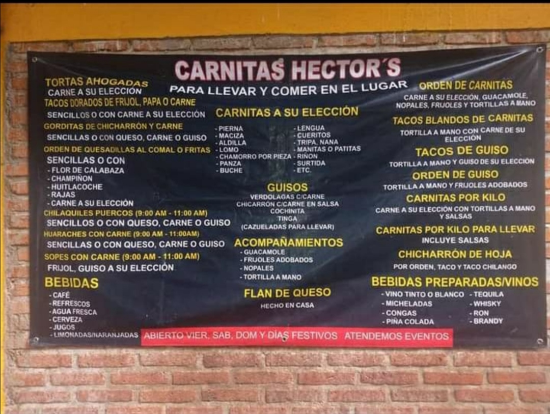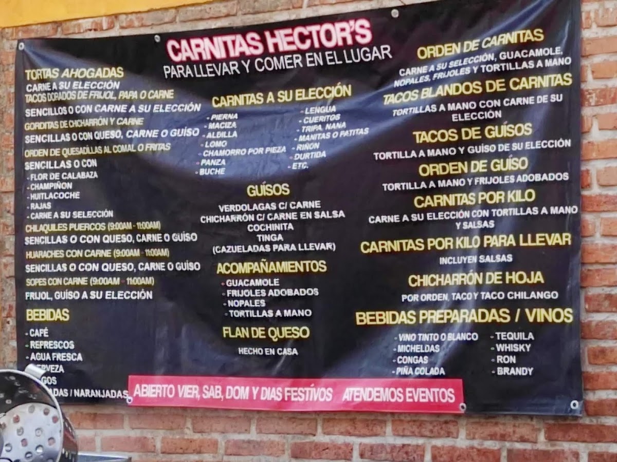 The restaurant also boasts a lovely Jardín - Terraza (Garden-Terrace), where guests can dine al fresco and enjoy the serene atmosphere. For those planning a special gathering or event, Carnitas Hector's offers Eventos (Event Services), ensuring a memorable experience with delicious food in a beautiful setting.